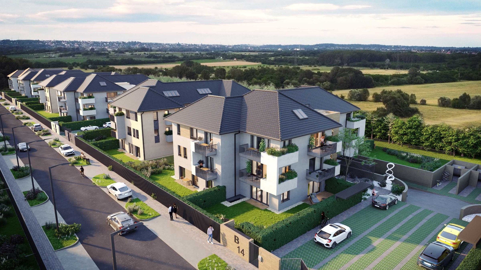 Minden épületnek napelem lesz a tetején és elektromos autó töltőállomások kerülnek kiépítésre a környezettudatosság jegyében.